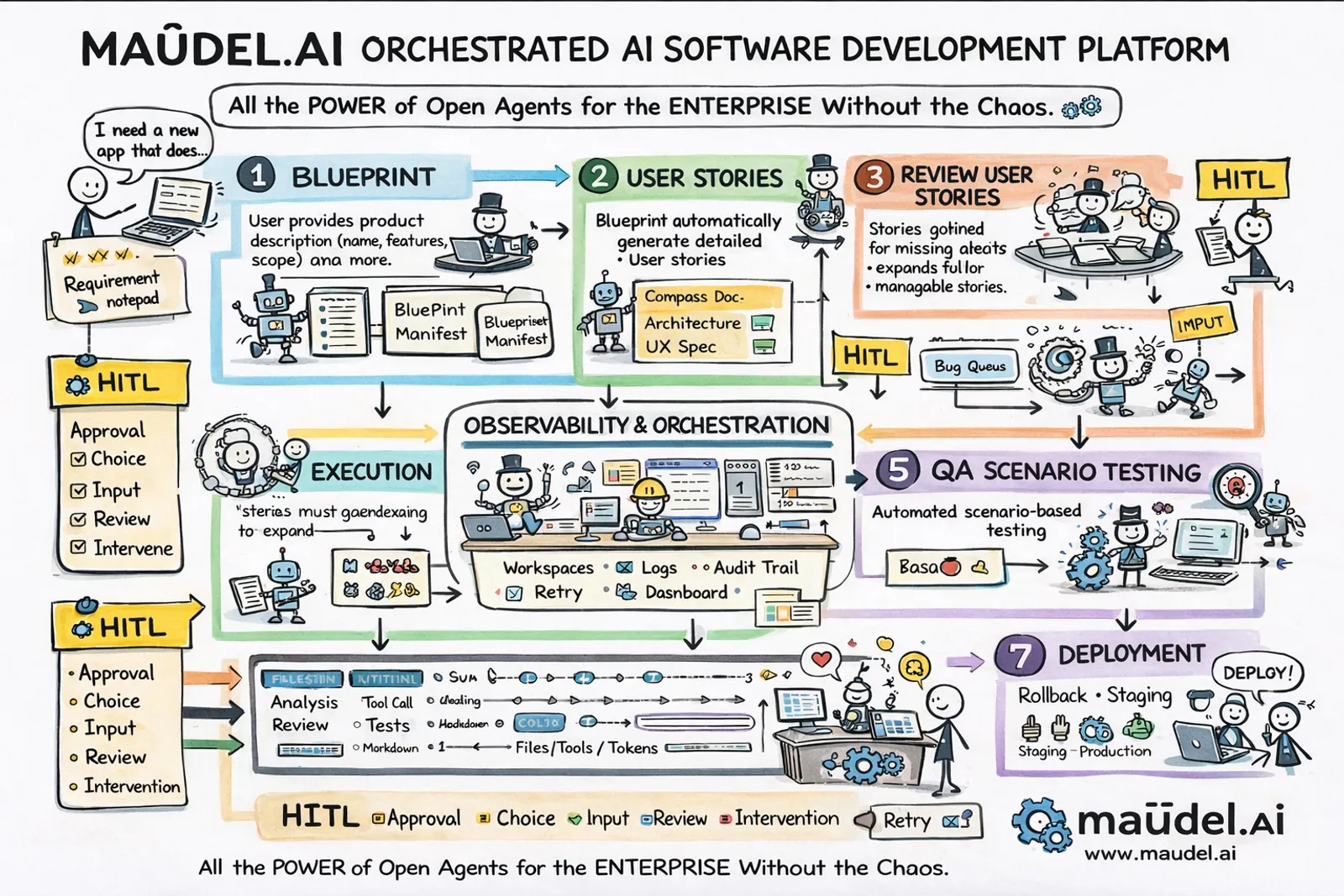 The Deterministic Orchestrator is the governing control system of Maudel. It manages the entire pipeline lifecycle, ensuring predictable execution, reproducibility, and enterprise-grade governance.